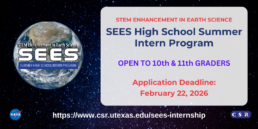 This summer UT/CSR will support a summer intern program where interns will complete distance learning modules prior to July 1 and work remotely June – July 3, guided by project mentors. The on-site internship will be July 5 – July 18, 2026. On-site interns return home on July 18. Housing, meals, and local transportation will be provided for those selected for scholarship and those fee-based students selected to attend. A limited number of travel scholarships to Texas may be available. Virtual internships vary by project and timelines are listed in the project description. All project teams will present their research during the Virtual SEES Science Symposium July 20-21, 2026.